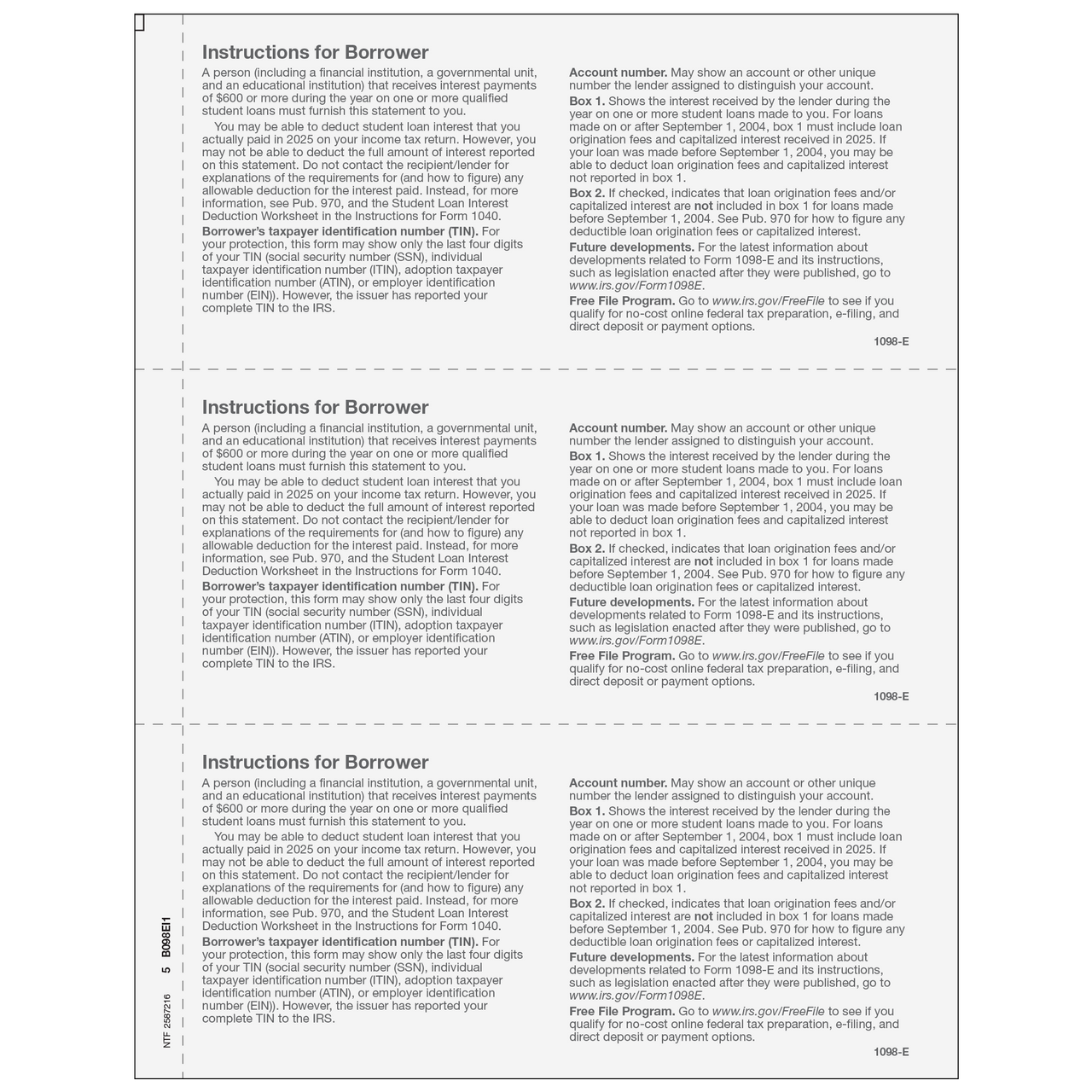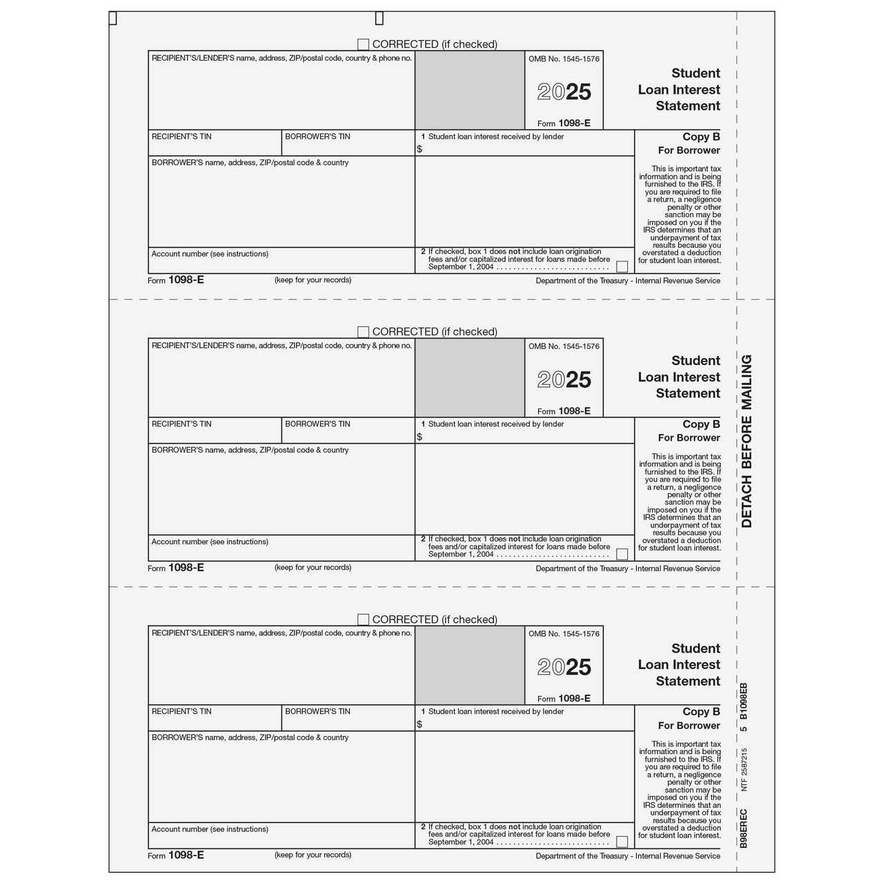 Student Loan Interest Statement. Use the 1098-E Copy B to print information for the borrower. Forms are 3up on an 8 1/2 x 11" sheet with a 1/2" side perforation and are printed on 20# laser paper. Mail to borrower in compatible envelopes. Order by number of forms, not sheets.