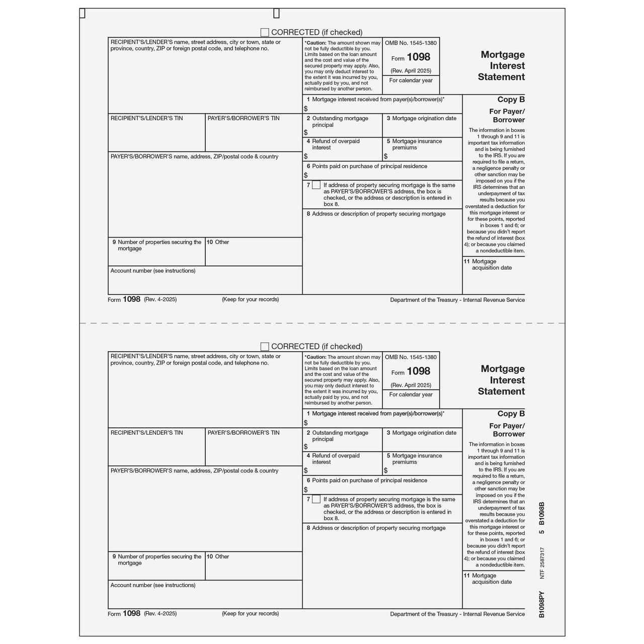 Mortgage Interest Statement. Use the 1098 Copy B to print information for Payer/Borrower. Forms are 2-up on an 8 ½” x 11” sheet and are printed on 20# laser paper. Mail to borrower in compatible double window envelopes. Order by number of forms, not sheets.