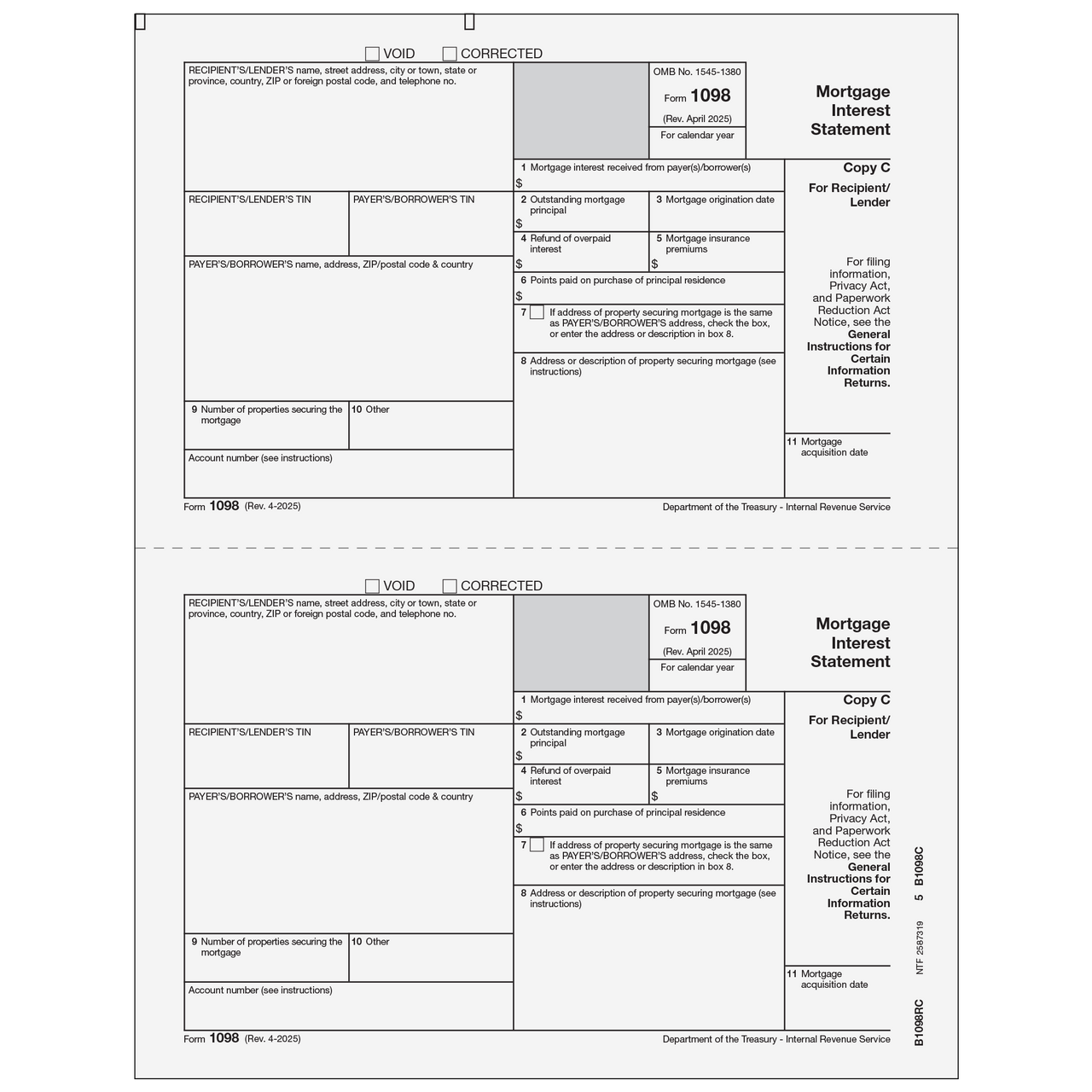 Mortgage Interest Statement. Use Form 1098 Copy C to print and mail payment information to the lender for submission with their federal tax return. 1098 forms are printed in a 2-up format (2 forms per page). Forms are 8 1/2 x 11" with no side perforation, and are printed on 20# laser paper. Order by number of forms, not sheets.