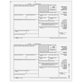 Mortgage Interest Statement. Use Form 1098 Copy C to print and mail payment information to the lender for submission with their federal tax return. 1098 forms are printed in a 2-up format (2 forms per page). Forms are 8 1/2 x 11" with no side perforation, and are printed on 20# laser paper. Order by number of forms, not sheets.