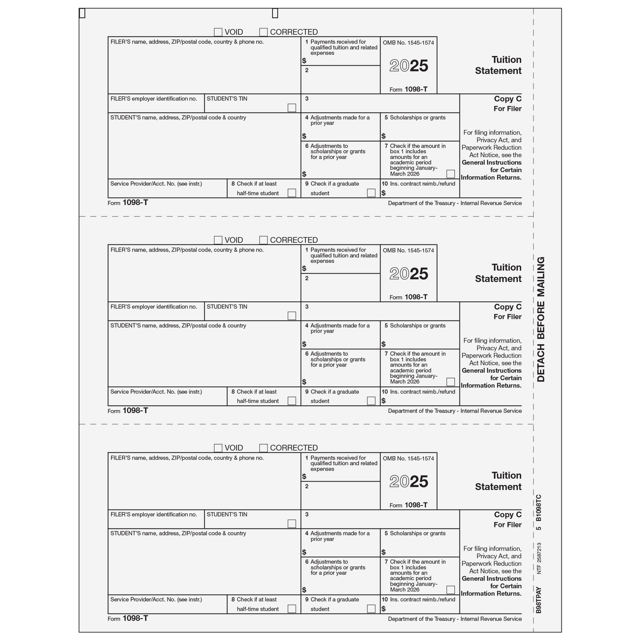 Tuition Statement. Use the 1098-T Copy C to print and mail tuition information to the filer for submission of their tax return. Forms are 3up on an 8 1/2 x 11" sheet with a 1/2" side perforation and are printed on 20# laser paper. Mail to the filer in compatible envelopes. Order by number of forms, not sheets.