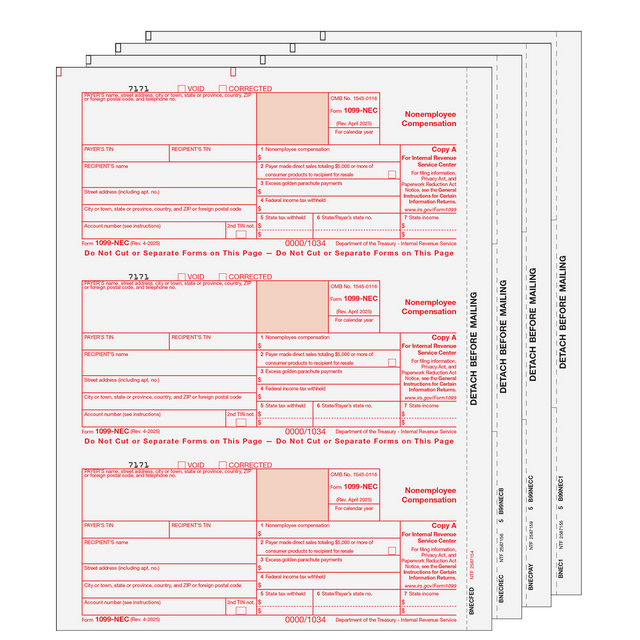 Copy A has a side perforation. Print each copy as a batch then separate and collate by recipient. Mail federal copies in a batch to the IRS. Mail recipient copies in compatible window envelopes. Order by number of forms, not sheets.