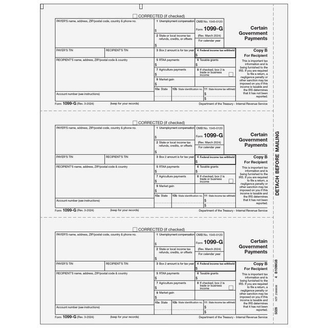 Certain Government Payments. Use Form 1099-G Recipient Copy B to print and mail payment information to recipients. All 1099-G forms are 3up on an 8 1/2 x 11" sheet with a 1/2" side perforation and printed on 20# laser paper. Mail in compatible window envelopes. Order by number of forms, not sheets.