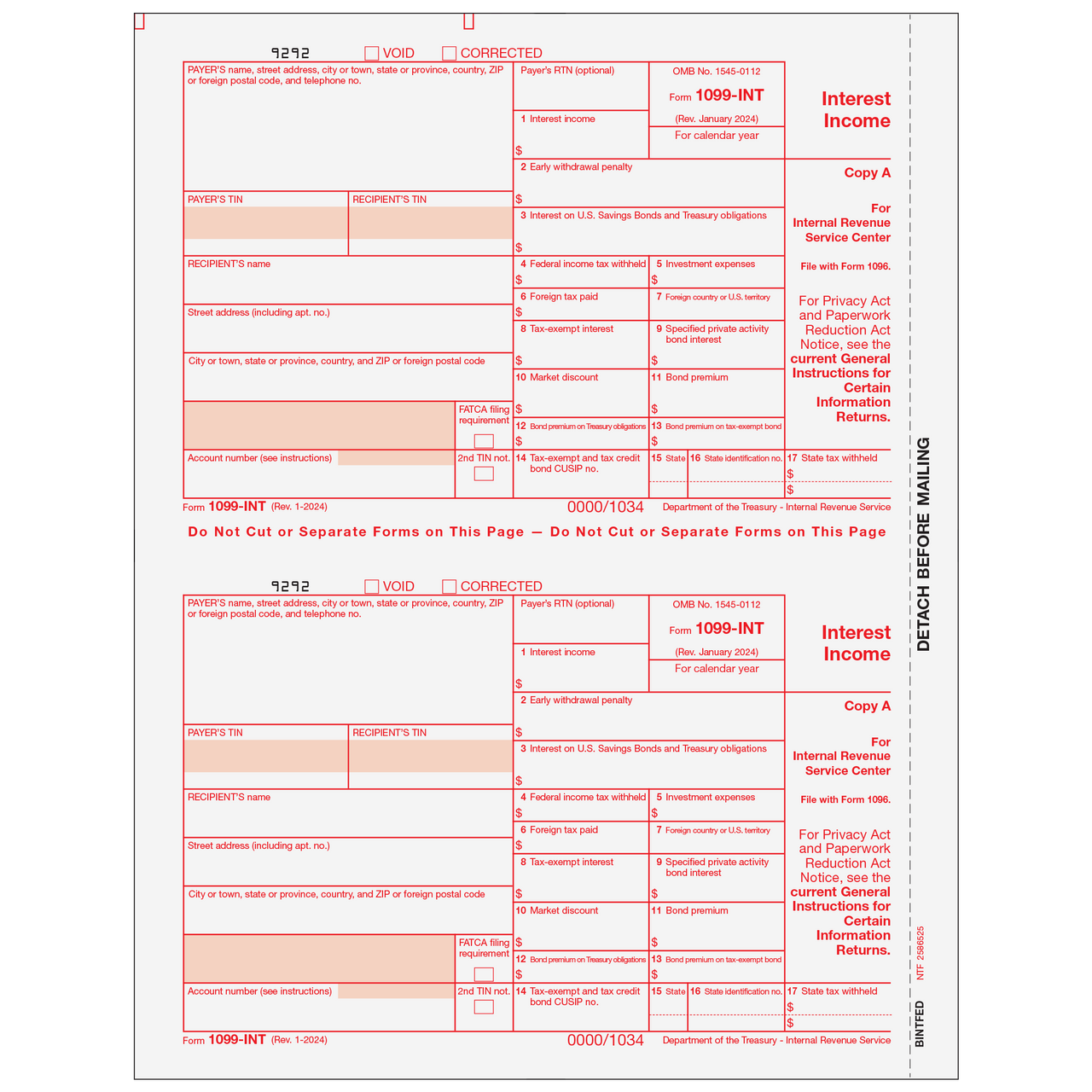 1099-INT Interest Income - Copy A Federal - 25 Qty