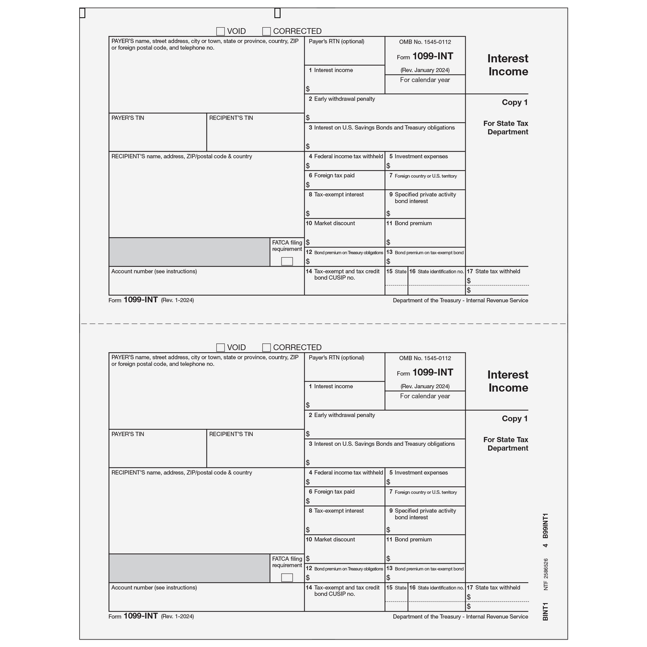 Interest Income. Use Form 1099-INT Copy 1 to print and mail payment information to the state. 1099-INT Forms are 2up on an 8 1/2" x 11" sheet and are printed on 20# laser paper. Mail in a batch to the state. Order by number of forms, not sheets.