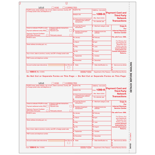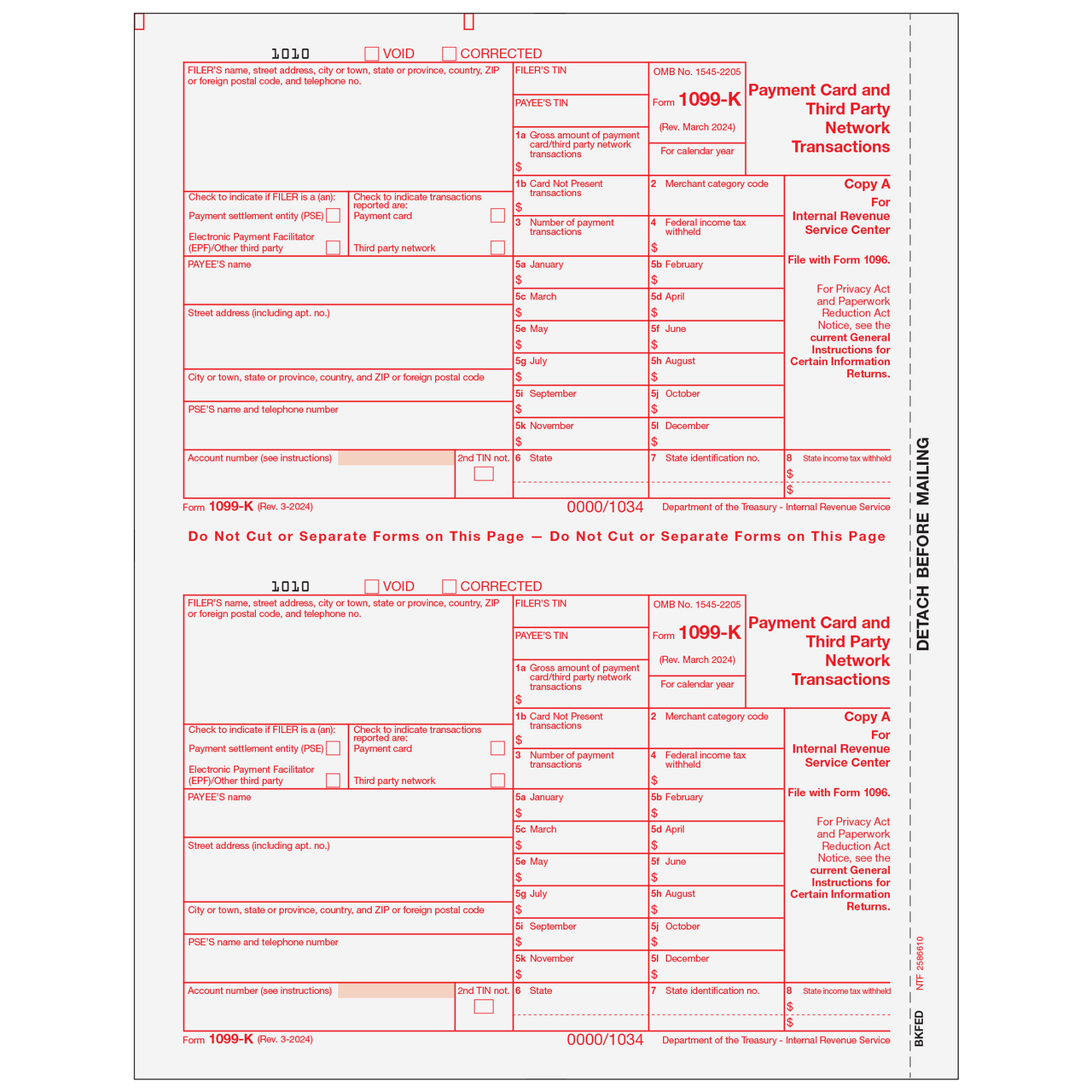 Payment Card and Third Party Network Transactions  Use Form 1099-K Copy A to print and mail payment information to the IRS. 1099-K forms are printed in a 2-up format on 8 1/2" x 11" paper with 1/2" side perforation, and are printed on 20# laser paper. Mail as a batch to the IRS. Order by number of forms, not sheets