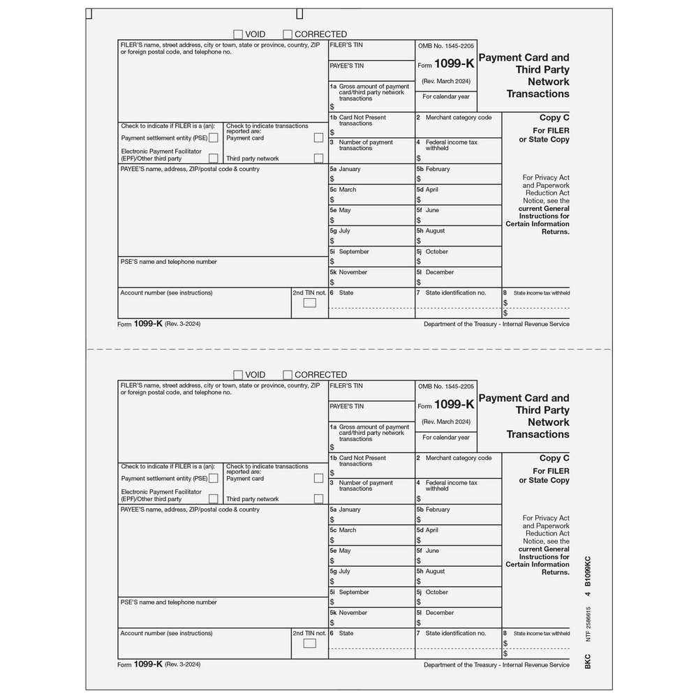 Payment Card and Third Party Network Transactions - Use Form 1099-K Copy C to print and mail to state or for filer's records. 1099-K Forms are printed in a 2-up format on an 8 1/2 x 11" and are printed on 20# laser paper. Order by number of forms, not sheets
