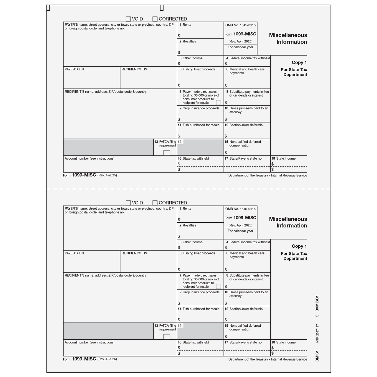 Miscellaneous Information. Use Form 1099-MISC Copy 1 to print and mail payment information to the State. 1099-MISC forms are printed in a 2-up format. Forms are on 8 1/2" x 11" paper with no side perforation, and are printed on 20# laser paper. Mail as a batch to the state. Order by number of forms, not sheets.
