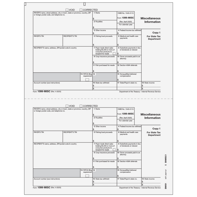 1099-MISC Miscellaneous Information - Payer State Copy 1 - 25 Qty