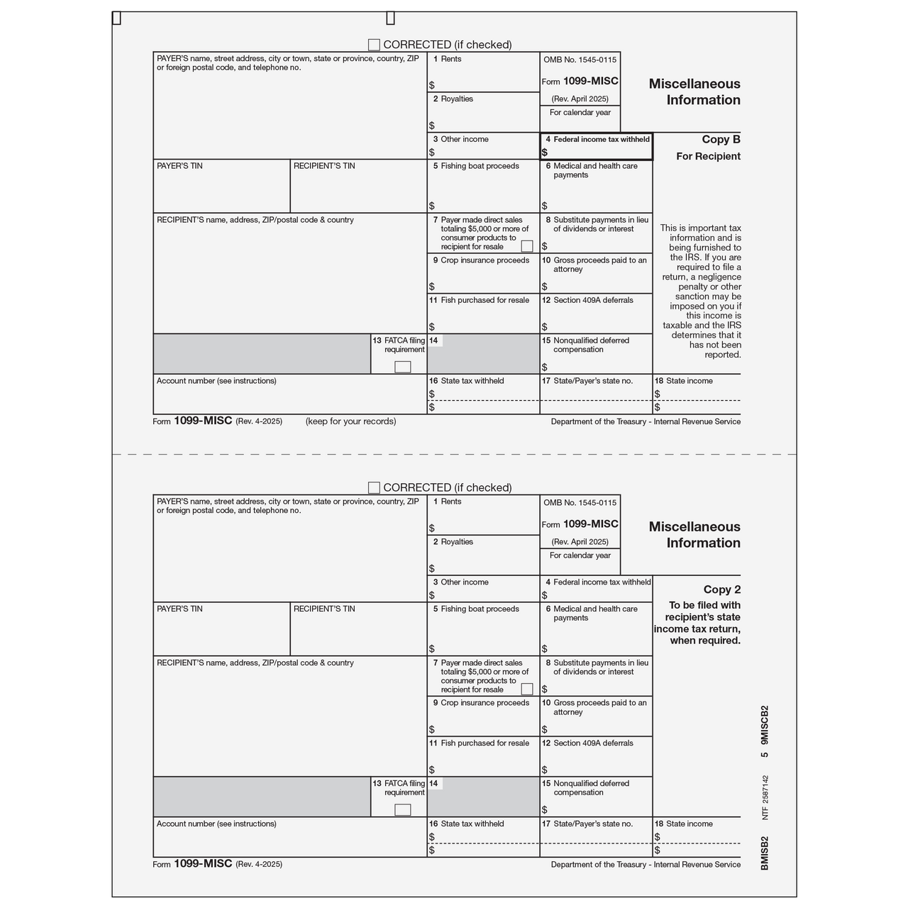 1099-MISC Miscellaneous Information - Recipient Copies B/2 - 25 Qty