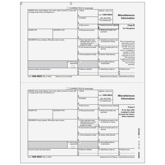Miscellaneous Income. Use Form 1099-MISC to print and mail to the recipient. The 1099-MISC Forms are 2up format (Recipient Copy B and State Copy 2). Instructions are on back of Copy B. Check your software for compatibility with 2 copies per page for same recipient. Mail in compatible window envelopes. Order based on the number of recipients.