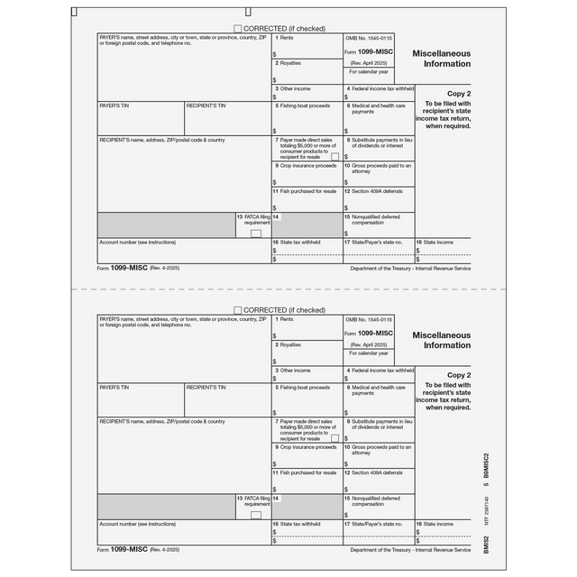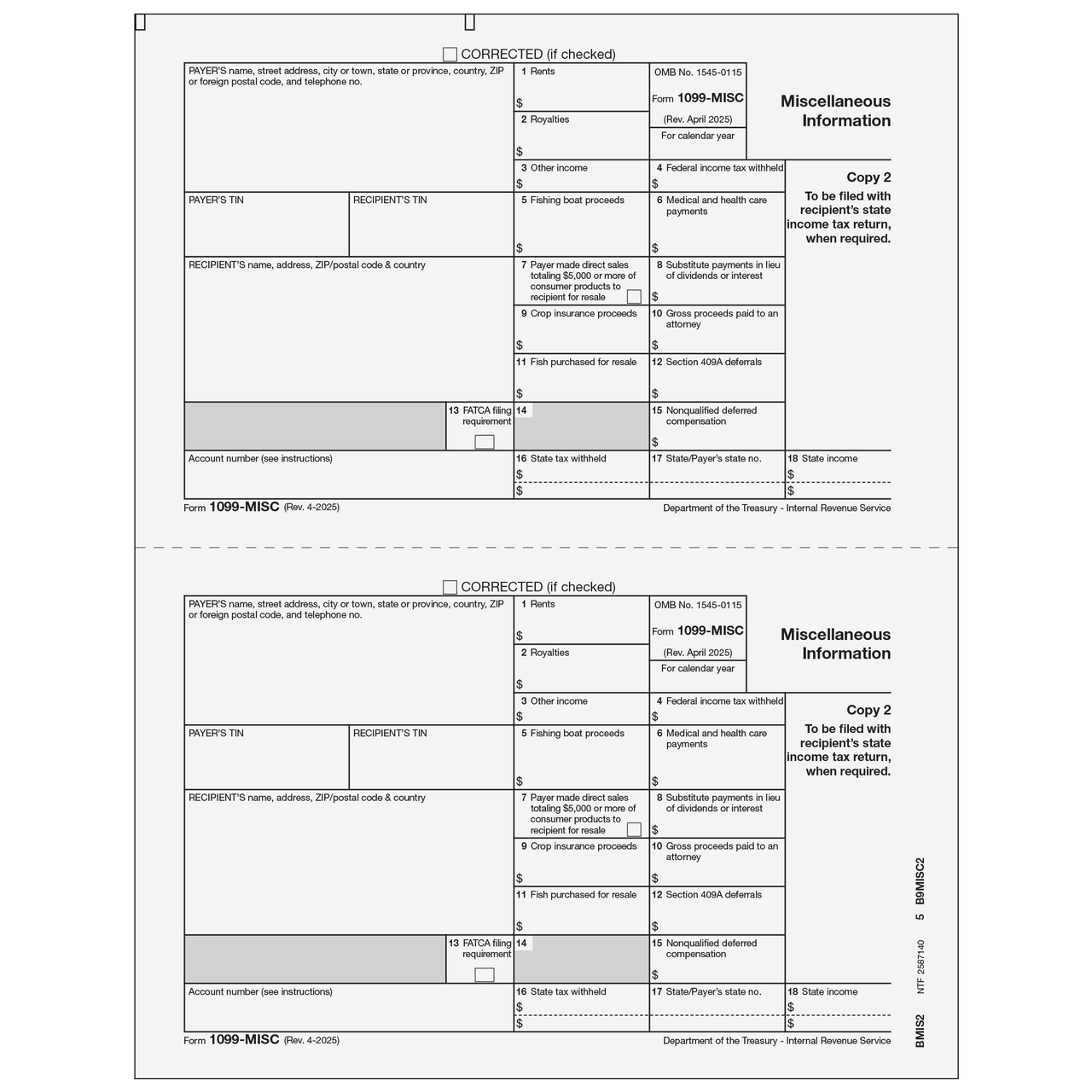 Miscellaneous Income. Use Form 1099-MISC Copy 2 to print and mail payment information to the recipient for submission with their state tax return. 1099-MISC forms are printed in a 2-up format (2 forms per page). Forms are 8 1/2 x 11" with no side perforation, and are printed on 20# laser paper. Order by number of forms, not sheets.
