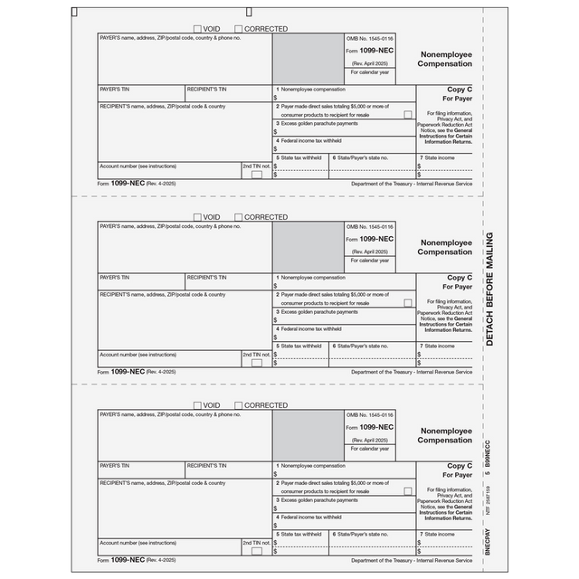 Non-Employee Compensation. Use Form 1099-NEC Copy C to print and mail payment information to the recipient for submission with their federal tax return. 1099-NEC forms are printed in a 3up format. Forms are 8 1/2" x 11" with no side perforation and are printed on 20# laser paper. Order by number of forms, not sheets.