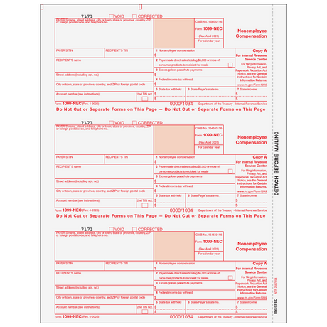 1099-NEC Non-Employee Compensation - Copy A Federal - 25 Qty