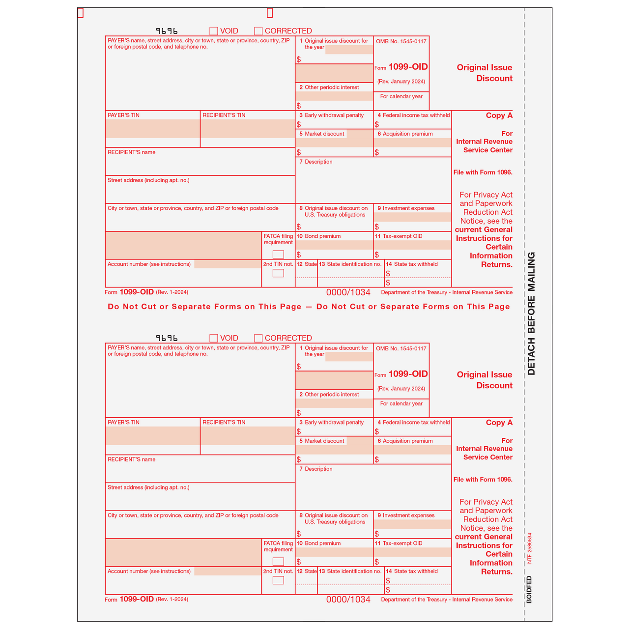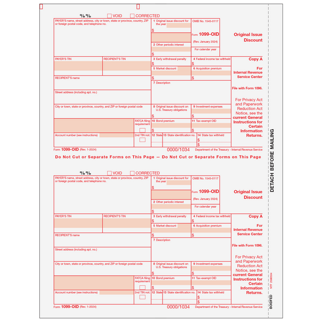 Form 1099-OID - Original Issue Discount. Use Form 1099-OID Copy A to print and mail payment information to the IRS. 1099-OID Forms are 2up on an 8 1/2 x 11" sheet with a 1/2" side perforation and are printed with required red scannable ink on 20# laser paper. Mail in a batch to the IRS. Order by number of forms, not sheets.