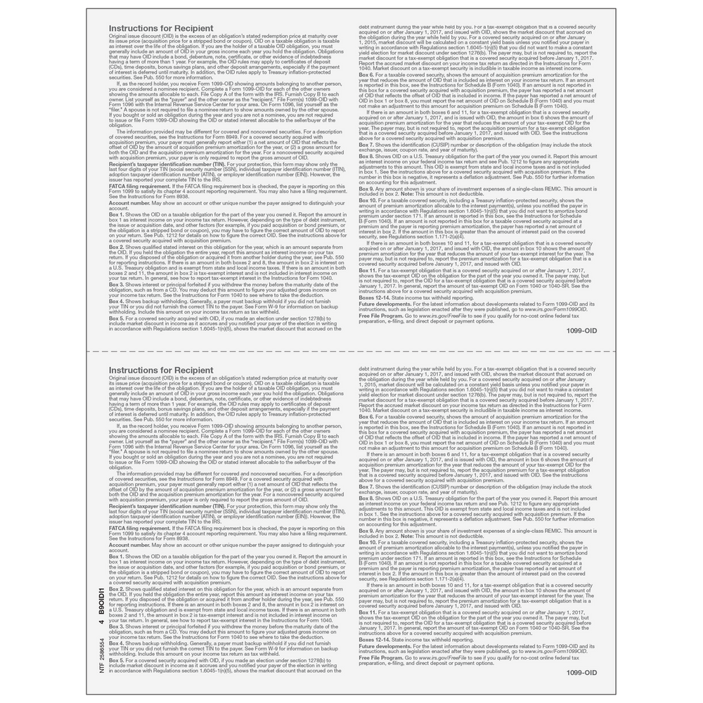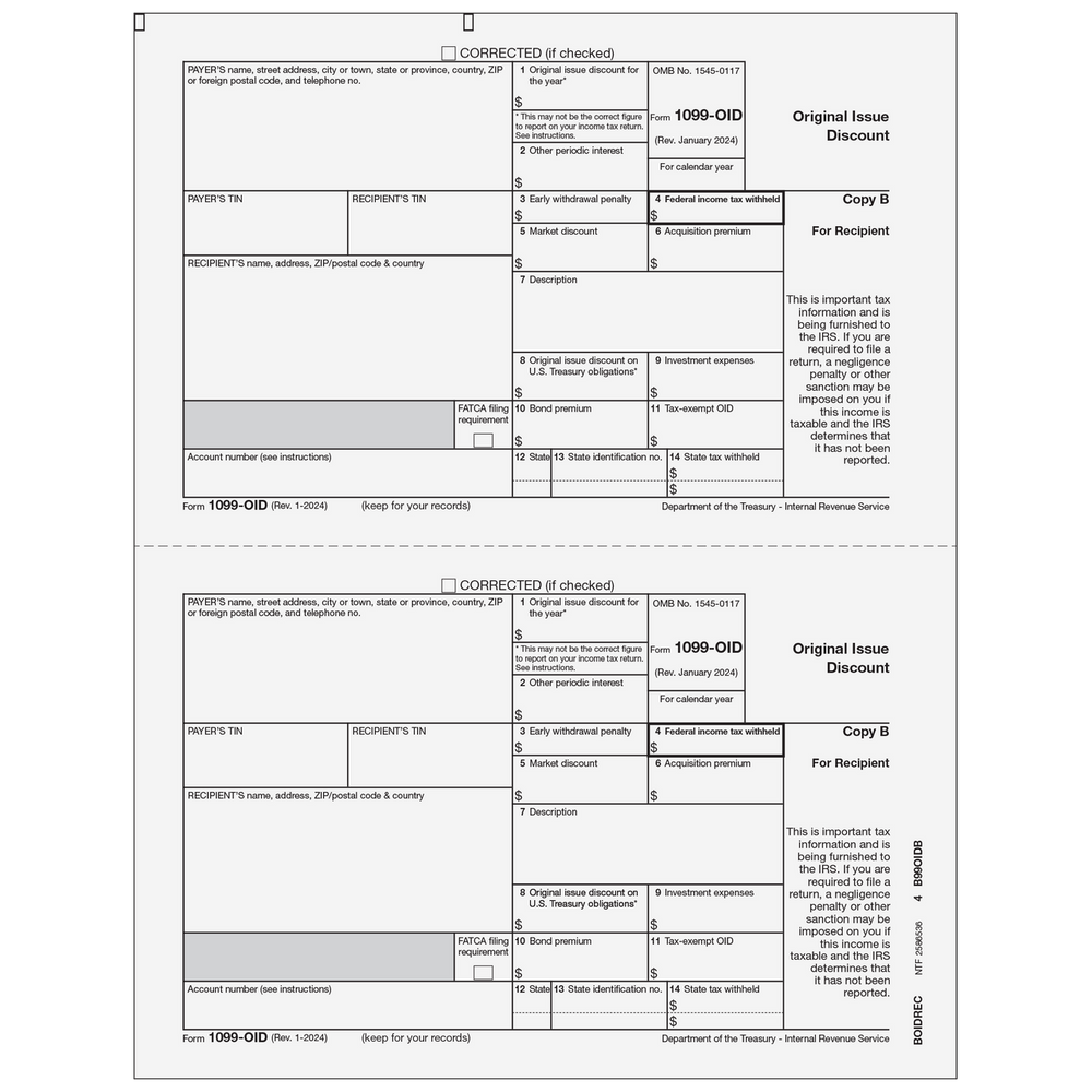 Original Issue Discount. Use Form 1099-OID Copy B to print and mail payment information to the recipient. Forms are 2up on an 8 1/2 x 11" sheet and are printed on 20# laser paper. Mail in compatible window envelopes. Order by number of forms, not sheets.