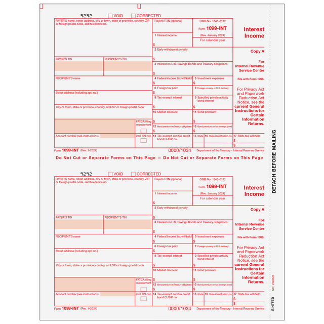 Interest Income. Use Form 1099-INT Copy A to print and mail payment information to the IRS. 1099-INT Forms are 2up on an 8 1/2 x 11" sheet with a 1/2" side perforation and are printed with required red scannable ink on 20# laser paper. Mail in a batch to the IRS. Order by number of forms, not sheets.