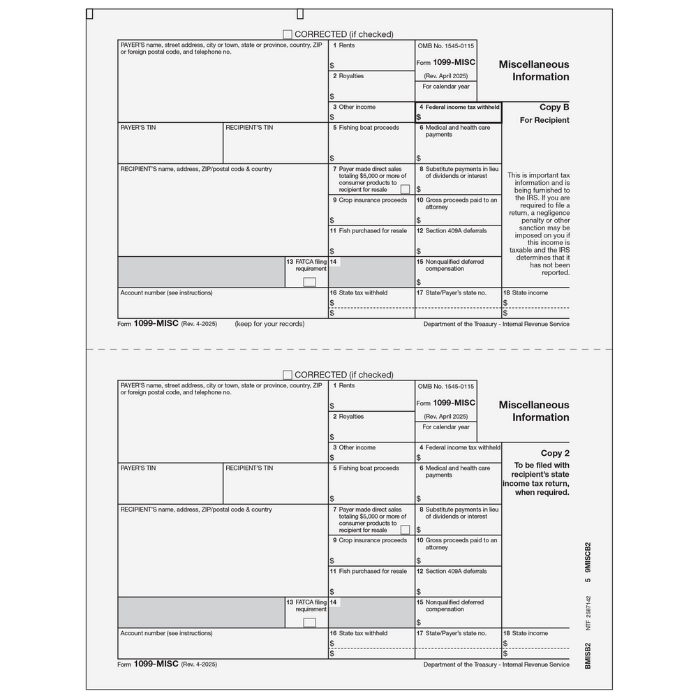 Miscellaneous Income. Use Form 1099-MISC to print and mail to the recipient. The 1099-MISC Forms are 2up format (Recipient Copy B and State Copy 2). Instructions are on back of Copy B. Check your software for compatibility with 2 copies per page for same recipient. Mail in compatible window envelopes. Order based on the number of recipients.