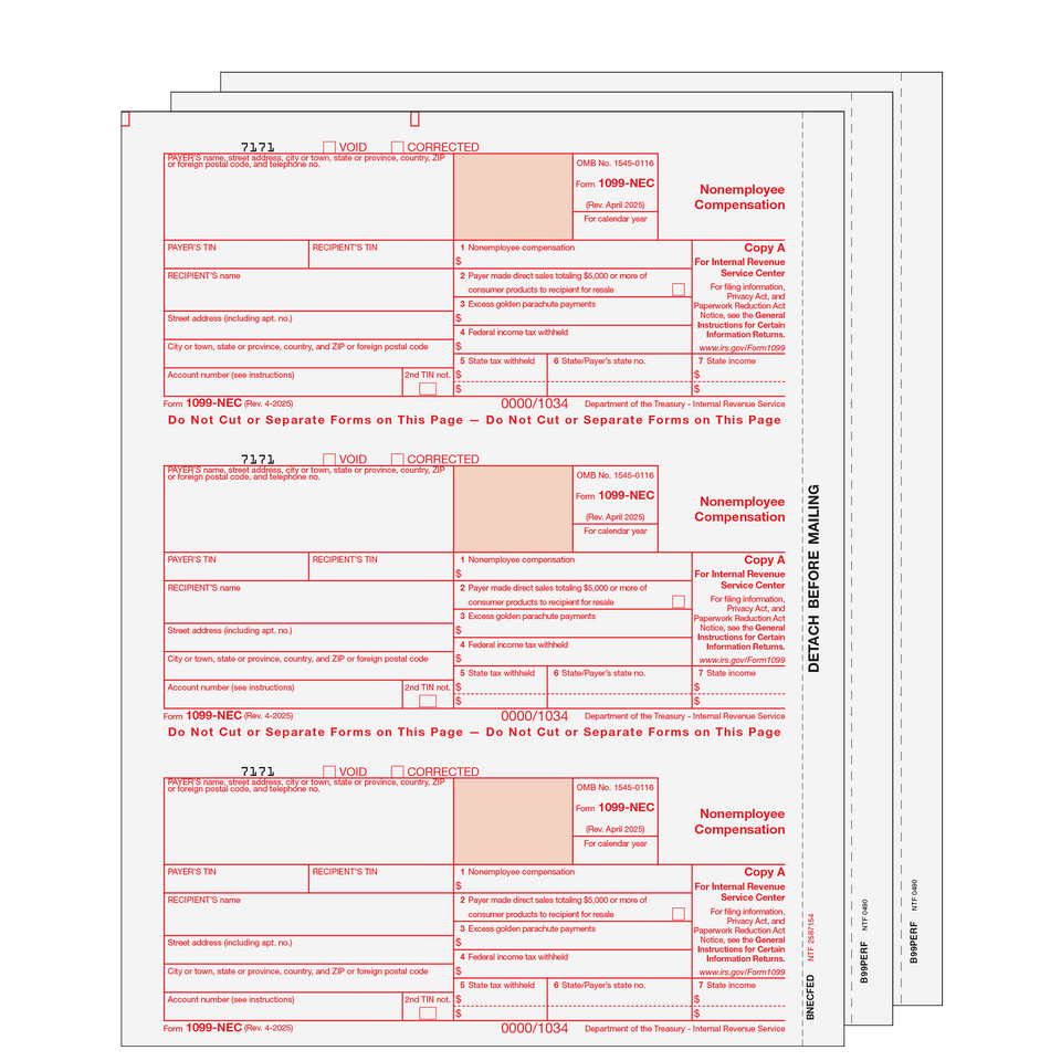 1099-NEC Non-Employee Compensation - 4/5-part Set (Blank Copies) - 25 Qty