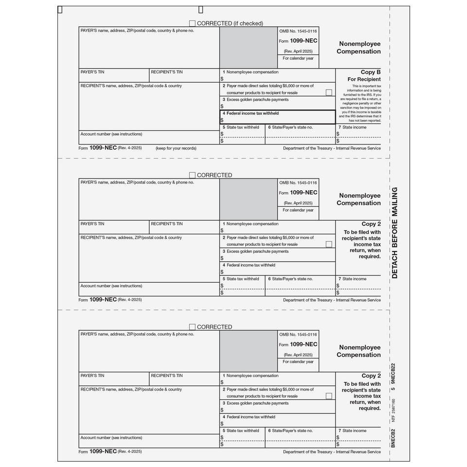 Non-Employee Compensation. Use Form 1099-NEC to print and mail to the recipient. The 1099-NEC Forms are 3up format (Recipient Copy B, State Copy 2 and State Copy 2). Instructions are on back of Copy B. Check your software for compatibility with 3 copies per page for same recipient. Mail in compatible window envelopes. Order based on the number of recipients.