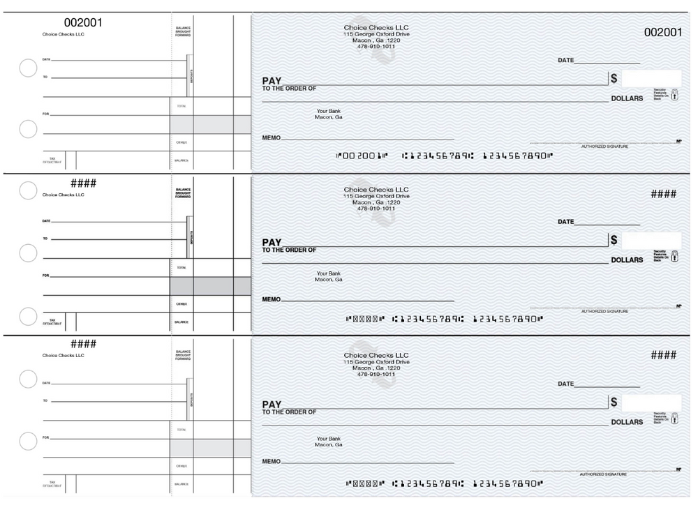 These premium 1-part, 3-to-a-page manual checks are are designed with numerous security features to help prevent check washing, forgery, and fraud. They are available in numerous stylish designs and work with both laser and inkjet printers for maximum efficiency. You choose the color and pattern. And they can be customized with your address and contact information.