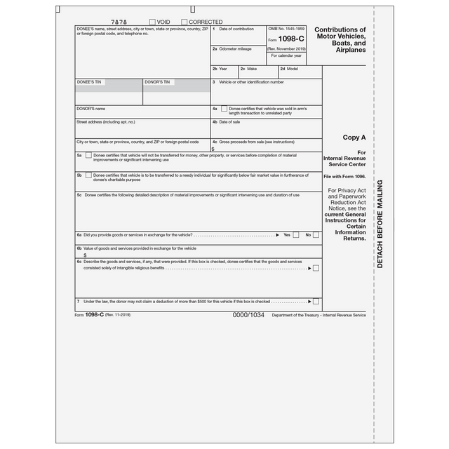 Contributions of Motor Vehicles, Boats, and Airplanes. Use Form 1098-C Copy A to print and mail payment information to the IRS. 1098-C forms are printed in a 1-up format, on 8 1/2" x 11" paper with 1/2" side perforation, and are printed on 20# laser paper. Mail as a batch to the IRS. Order by number of sheets.