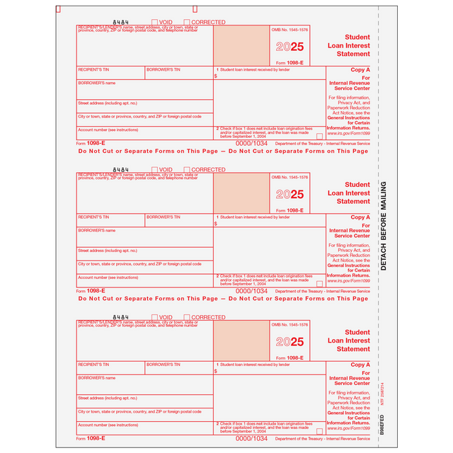 Student Loan Interest Statement. Use the 1098-E Copy A to print and mail payment information to the IRS. Forms are 3up on an 8 1/2 x 11" sheet with a 1/2" side perforation and are printed with red scannable ink on 20# laser paper. Mail in a batch to the IRS. Order by number of forms, not sheets.