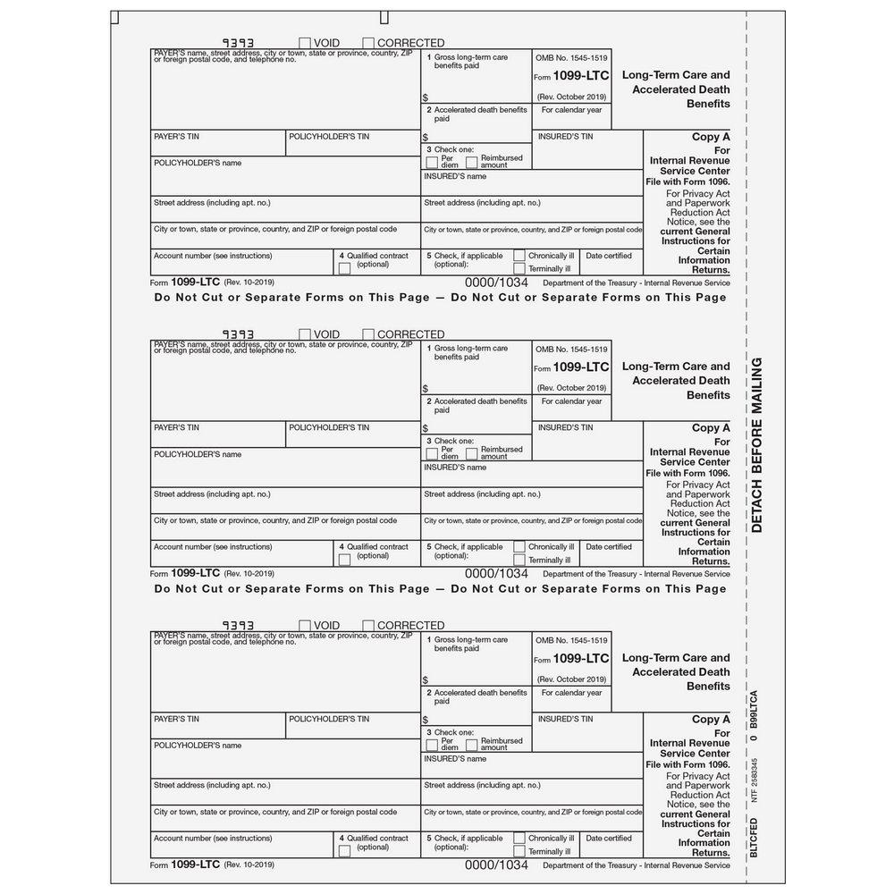 Long Term Care & Accelerated Death Benefits. Use Form 1099-LTC Copy A to print and mail payment information to the IRS. 1099-LTC Forms are 3up on an 8 1/2 x 11" sheet with a 1/2" side perforation and are printed with black ink on 20# laser paper. Mail in a batch to the IRS. Order by number of forms, not sheets.