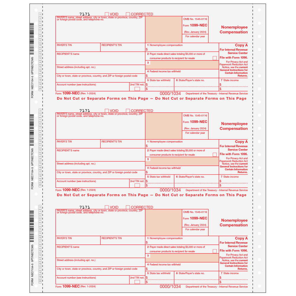 Non-Employee Compensation. Your typewriter or pin-fed printer will print all copies at the same time. Mail Federal copies in a batch to IRS, State copies to the State. Separate and collate recipient copies and mail in compatible window envelopes. Order by number of forms, not sheets.