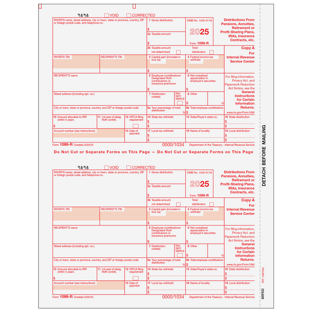 Distributions From Pensions, Annuities, Retirements or Profit-Sharing Plans, IRAs, and Insurance Contracts. Use Form 1099-R Copy A to print and mail payment information to the IRS. 1099-R Forms are 2up on an 8 1/2" x 11" sheet with a 1/2" side perforation and printed with required red scannable ink on 20# laser paper. Mail in a batch to the IRS. Order by number of forms, not sheets.