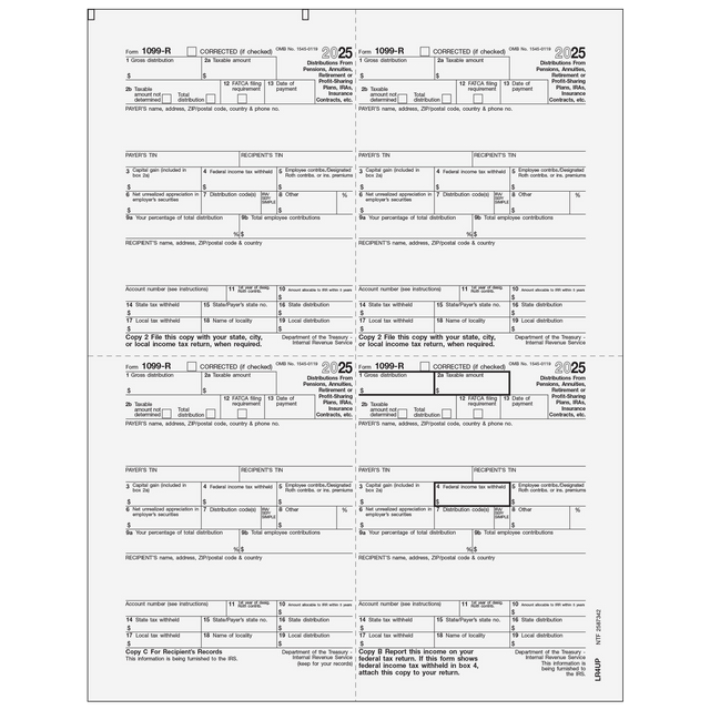 Distributions From Pensions, Annuities, Retirements, or Profit Sharing Plans, IRAs, and Insurance Contracts. Use Form 1099-R Condensed 4up to print all recipient copies on one sheet. The recipient receives copies 2 (State), 2 (City), B (Federal), C (Record). 1099-R Forms are 4up on an 8 1/2" x 11" sheet and printed in black ink on 20# laser paper. Mail recipient copies in compatible window envelopes. Order by number of sheets.