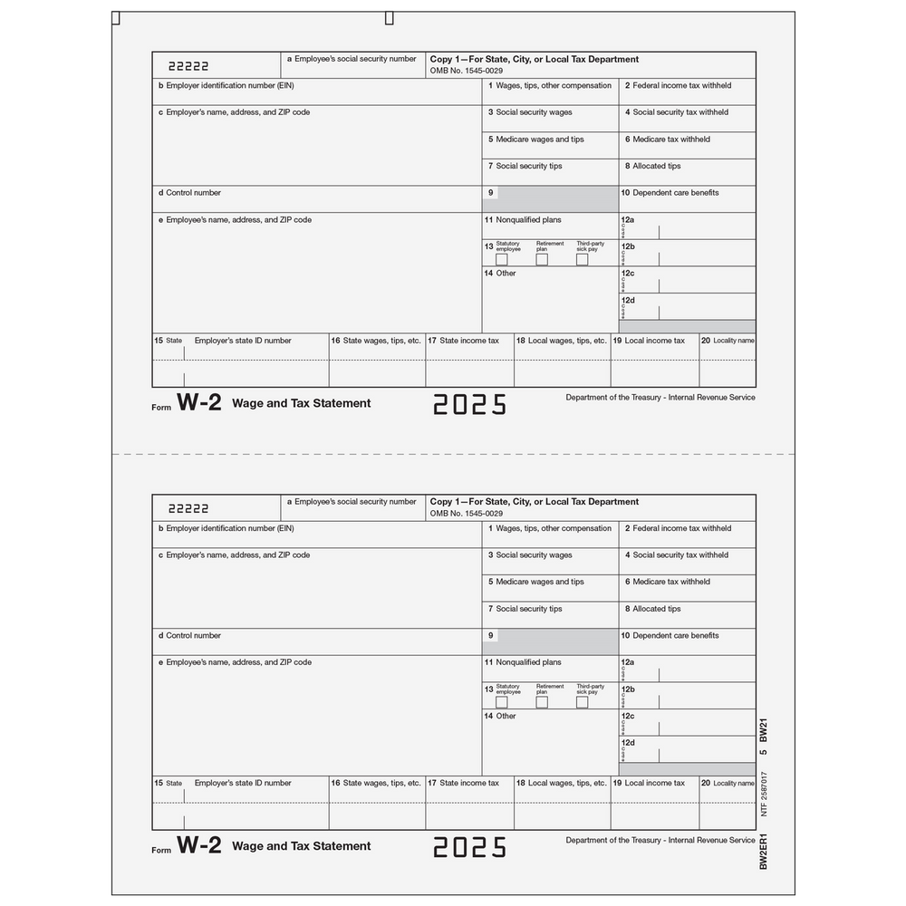 Form W-2 - Wage & Tax Statement. Use Form W-2 Copy 1 to print employer wage and withholding information to send to the state or city. W-2 forms are preprinted with black ink, 2-up on a sheet with no side perforation. Mail in a batch to the state or city. Order by number of forms, not sheets.