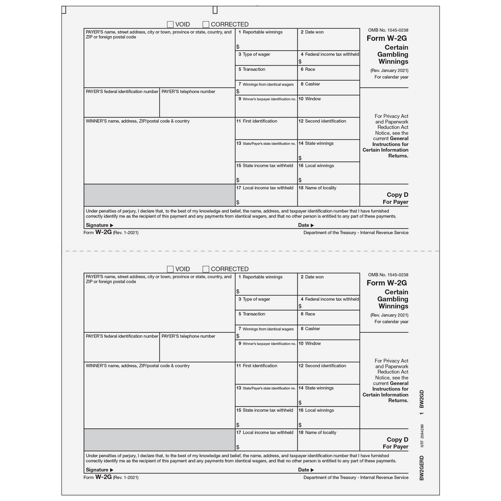 Form W-2G - Certain Gambling Winnings. Use Form W-2G Copy D to print payer record copies. W-2G forms are preprinted with black ink, 2-up on a sheet with no side perforation. Order by number of forms, not sheets.