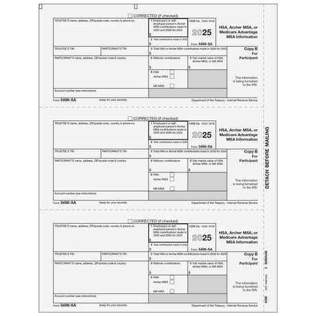 Form 5498-SA HSA, Archer MSA, or Medicare Advantage MSA Information Copy B Participant - 25 Qty