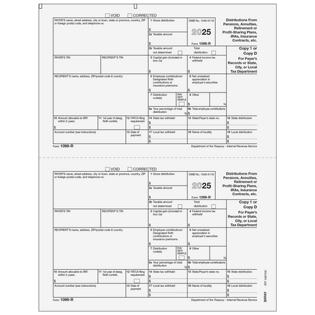 Regular price $3.84Unit price /UnavailableForm 1099-R Distributions From Pensions, etc. Copy D/1 Payer/State - 25 Qty