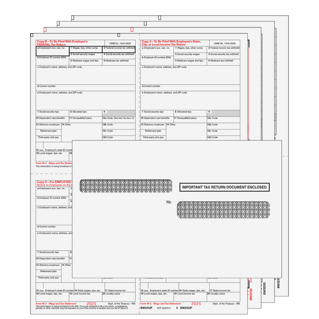 Check your software for compatibility. Employee copies are provided on a 4-up quadrant form and are ready to fold, insert, and mail. Print each copy in a batch. No collating required. Order by number of forms, not sheets.