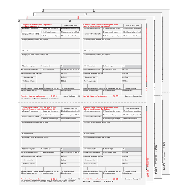 Check your software for compatibility. Employee copies are provided on a 4-up quadrant form and are ready to fold, insert, and mail. Print each copy in a batch. No collating required. Order by number of forms, not sheets.