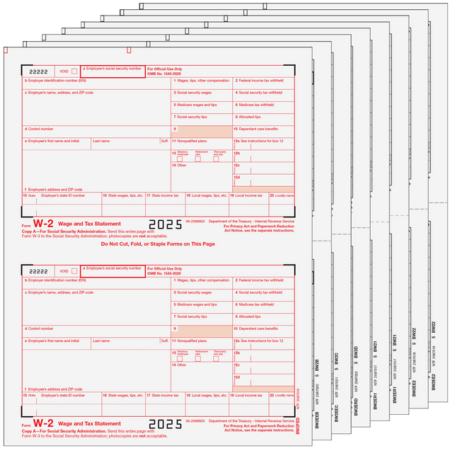 Print each copy as a batch, then separate and collate by employee. Mail employer copies in a batch to the SSA with W-3. Order the quantity equal to the number of employees for which you file. Order by number of forms, not sheets.