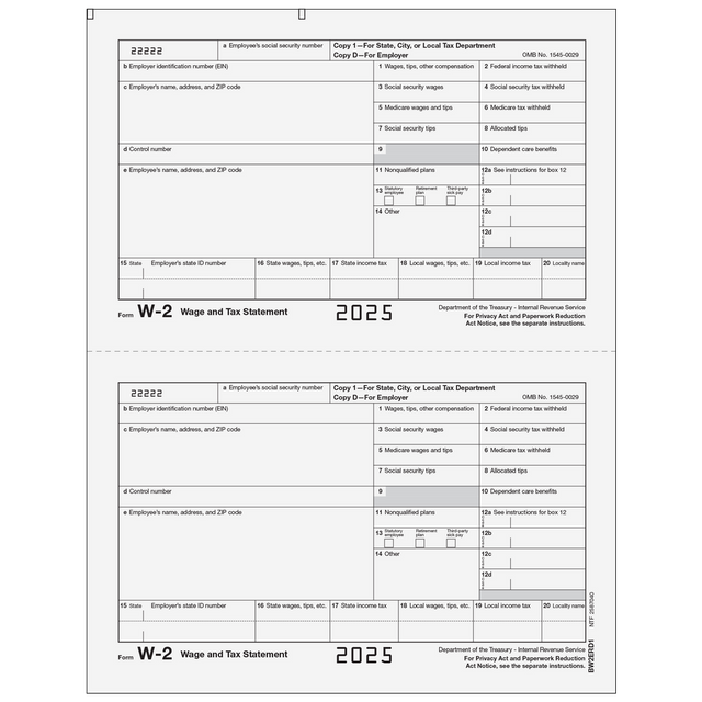 Form W-2 - Wage & Tax Statement. Use Form W-2 Copy 1 or D to print employer state, city or local, or record copies. W-2 forms are preprinted with black ink, 2-up on a sheet with no side perforation. This form can be used for two employees per sheet or one. Order by number of forms, not sheets.