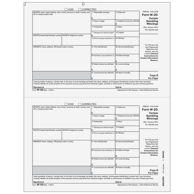 Form W-2G - Certain Gambling Winnings. Use Form W-2G Copy D to print payer record copies. W-2G forms are preprinted with black ink, 2-up on a sheet with no side perforation. Order by number of forms, not sheets.