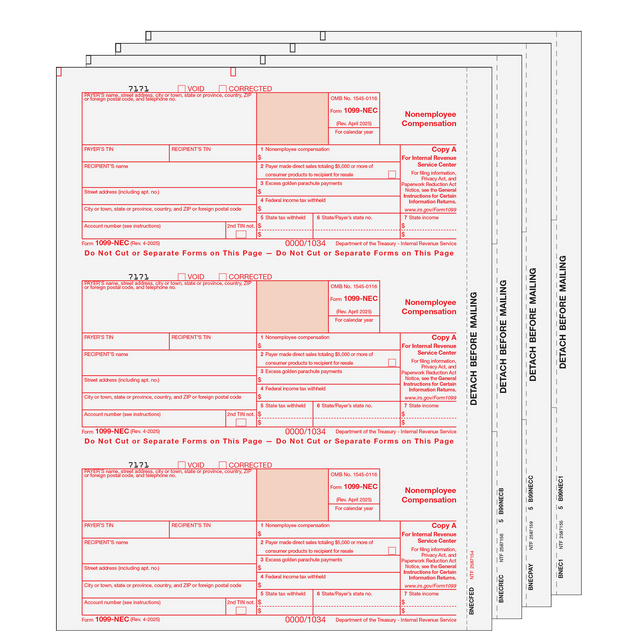 Copy A has a side perforation. Print each copy as a batch then separate and collate by recipient. Mail federal copies in a batch to the IRS. Mail recipient copies in compatible window envelopes. Order by number of forms, not sheets.